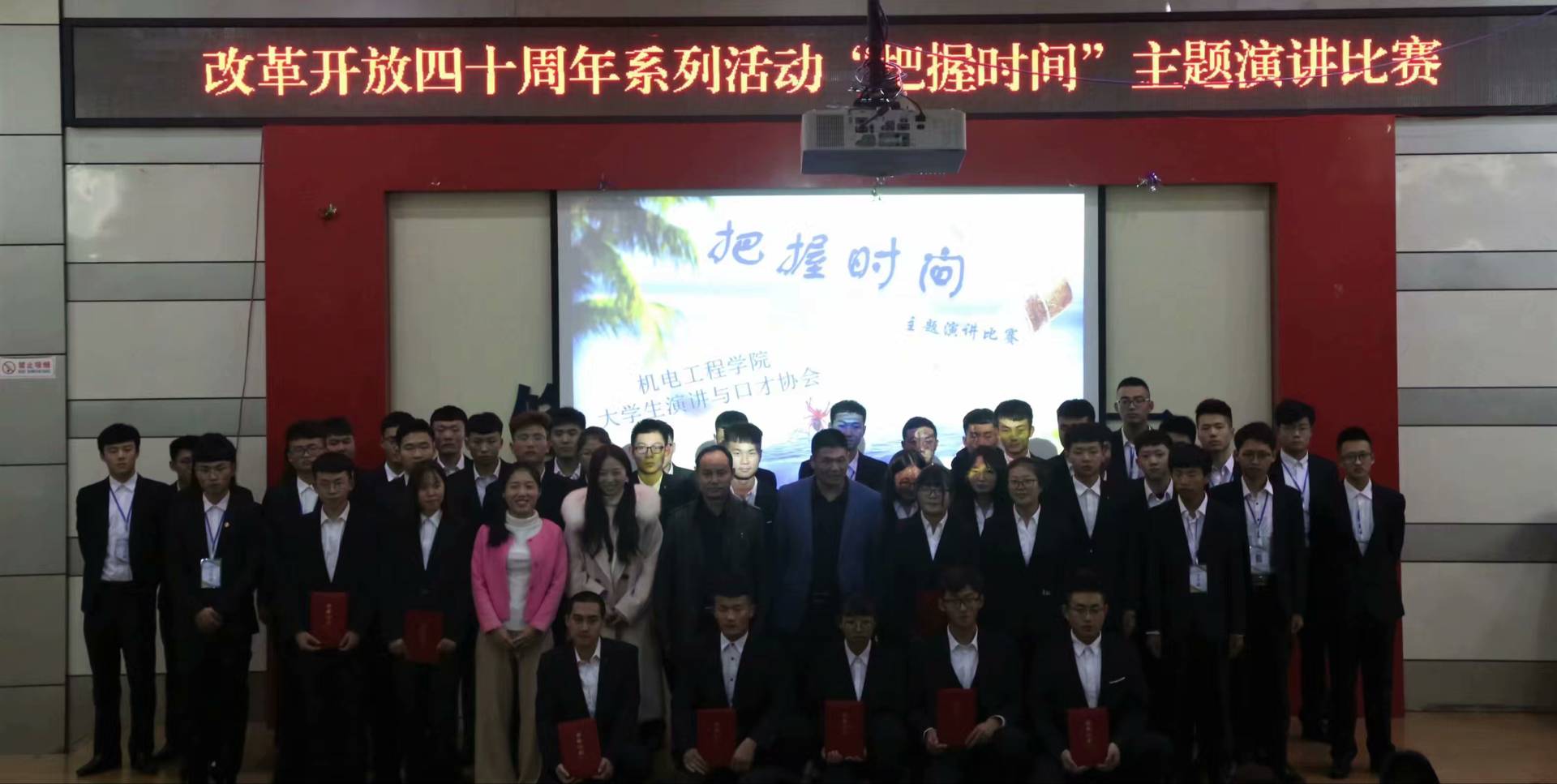 2018年11月26日晚上18:50在一号报告厅举行以“把握时间”为主题的演讲比赛。主办方:机电工程学院大学生口才与演讲协会,主要组织人员:鲁多,任书楷。出席本次活动的评委:机电工程学院院长陈宏波、机电工程学院团总支书记许卫华、机电工程学院辅导员田文霞、机电工程学院辅导员王滢。