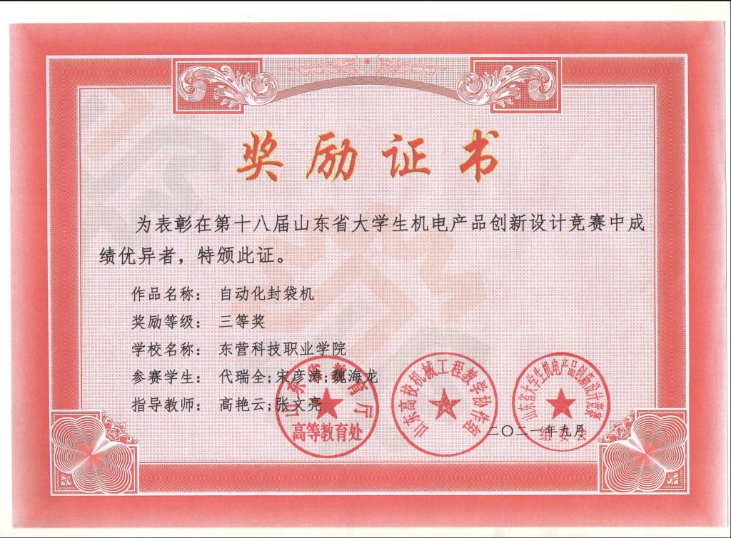 近日,第十八届(2021年)山东省大学生机电产品创新设计竞赛决赛成功举行。金年会金年会诚信信誉至上学生代瑞全、宋彦涛、魏海龙的团队作品《自动化封袋机》荣获三等奖。