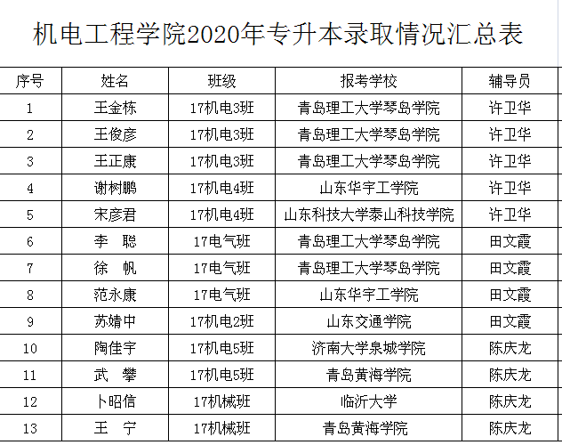 日前,山东省2020年专升本成绩揭晓。金年会jinnianhuicom机电工程学院2020年参加专升本考试共计28人,录取13人,录取率达46.43%。其中王金栋、王俊彦、王正康、李聪、徐帆等考入青岛理工大学琴岛学院;谢树鹏、范永康等考入山东华宇工学院;宋彦君考入山东科技大学泰山科技学院;苏婧中考入山东交通学院;陶佳宇考入济南大学泉城学院;卜昭信考入临沂大学;王宁、武攀等考入青岛黄海学院。